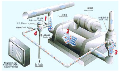 1、電腦程序控制器啟動清洗循環(huán),將注射閥門打開,控制特殊球進入冷凝器循環(huán)系統(tǒng); 2、尺寸比管道稍大的軟質(zhì)材料制成的特殊球通過冷凝器,將冷凝器管壁上的水垢和污垢帶走; 3、特殊球通過冷凝器后,被回收器接收; 4、電腦程序控制器打開排水閥門,球自動回到球注入槽,槽中的水自動將特殊球進行清洗、排污、排水閥門關(guān)閉,完成一次循環(huán)。遵此電腦程序每天進行36次循環(huán)清洗。 |
