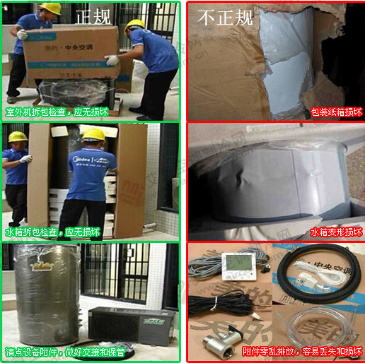 非專業(yè)安裝,讓你可能面臨:樓房裝修破壞,無限的高強度噪音,一系列安全隱患……只有通過專業(yè)的空調安裝,你的安全才能得到保障,才能真正享受中央空調帶來的舒適感受。 1、拆包檢查