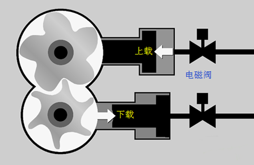 柱塞式調(diào)節(jié)被廣泛應(yīng)用于螺桿式冷水機(jī)組調(diào)節(jié)。下圖為某品牌冷水機(jī)組柱塞式調(diào)節(jié)示意圖。