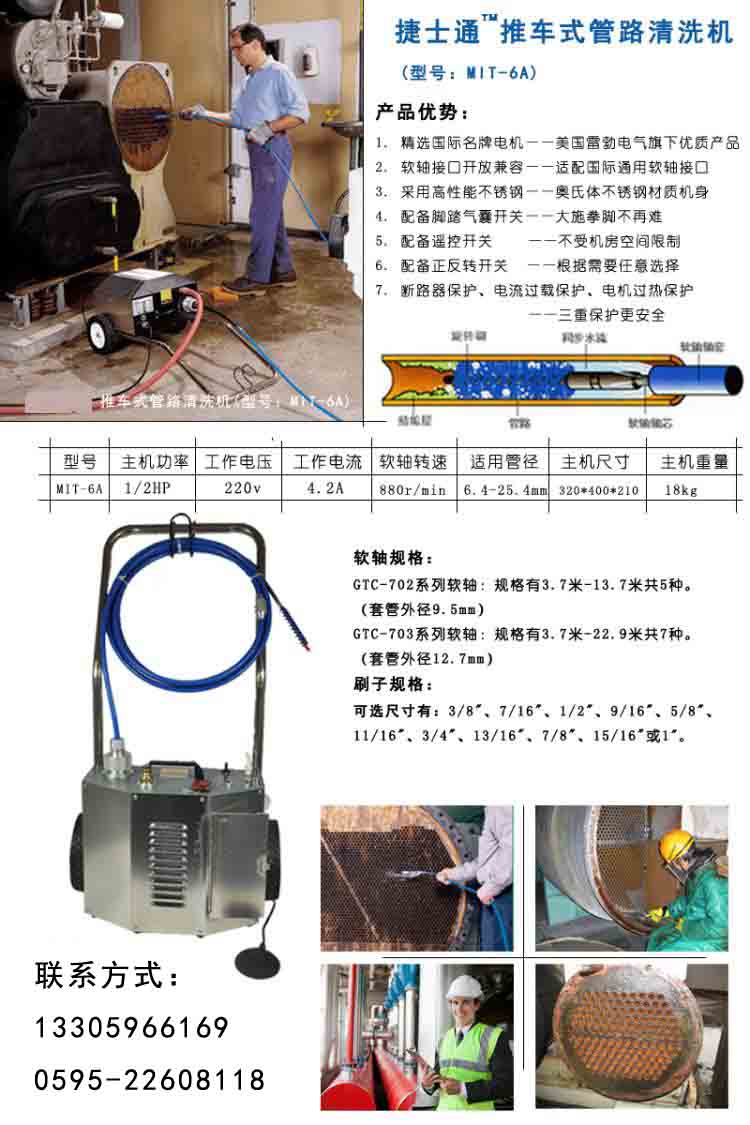 國內(nèi)首創(chuàng)中央空調(diào)冷凝器清洗軟軸緩解裝置.清洗機(jī)軟軸造價(jià)昂貴但同時(shí)又極易損壞,這成了所有工程人員面臨的巨大難題.我公司在2006年即成立軟軸科研項(xiàng)目小組,不斷提高軟軸材質(zhì)并多次人工模擬極端惡劣環(huán)境進(jìn)行試驗(yàn).同時(shí),科研人員在07年底設(shè)計(jì)出軟軸緩解裝置,該裝置在軟軸卡住的情況下將電機(jī)輸送力度減小%60,這樣可以有效的保護(hù)軟軸.這一技術(shù)在08年得到了完善并于09年正式面市.精選的材質(zhì)和獨(dú)到的保護(hù)裝置使軟軸使用壽命延長一倍以上. 二, 刷頭工具采用上等材質(zhì)精致而成,刷頭種類更多,刷毛有效長度增加,清洗效率也大大提高.刷毛的材質(zhì)直接影響到清洗的效率而刷頭的整體尺寸更是影響到軟軸的動力傳輸.刷頭選用不合理很可能造成軟軸卡在銅管里,嚴(yán)重時(shí)軟軸將直接斷掉.我公司技術(shù)人員多次分析比較不同規(guī)格刷頭的使用效果,進(jìn)而設(shè)計(jì)出清洗效率更高同時(shí)對軟軸力度傳輸影響又最小的刷頭規(guī)格. 三, 主機(jī)采用多級控制電路.該技術(shù)可保證主機(jī)的使用連續(xù)性,保證用戶的清洗工程不會因?yàn)闄C(jī)器不能使用而耽誤.